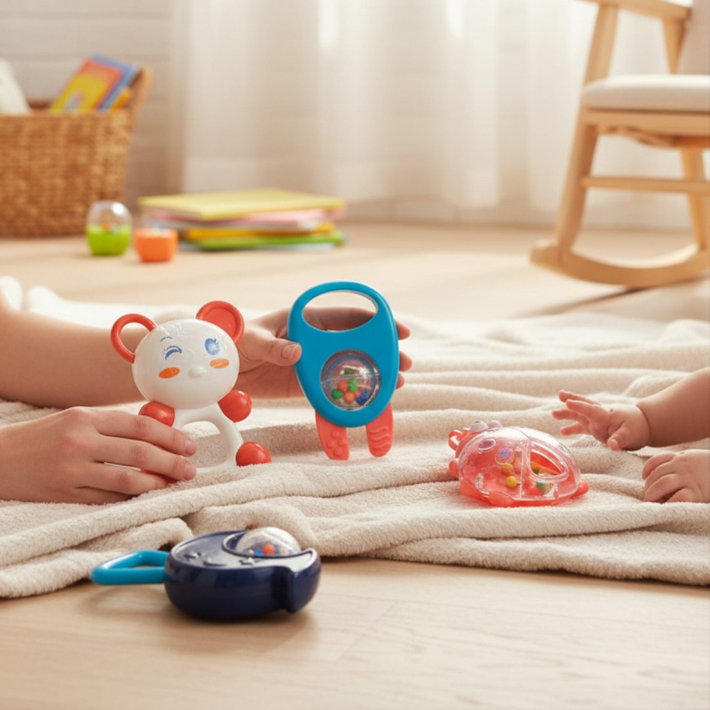 A különböző formájú és színű zörgők segítenek a mozgáskoordináció, hallás és tapintás fejlesztésében, miközben biztonságos szórakozást nyújtanak.