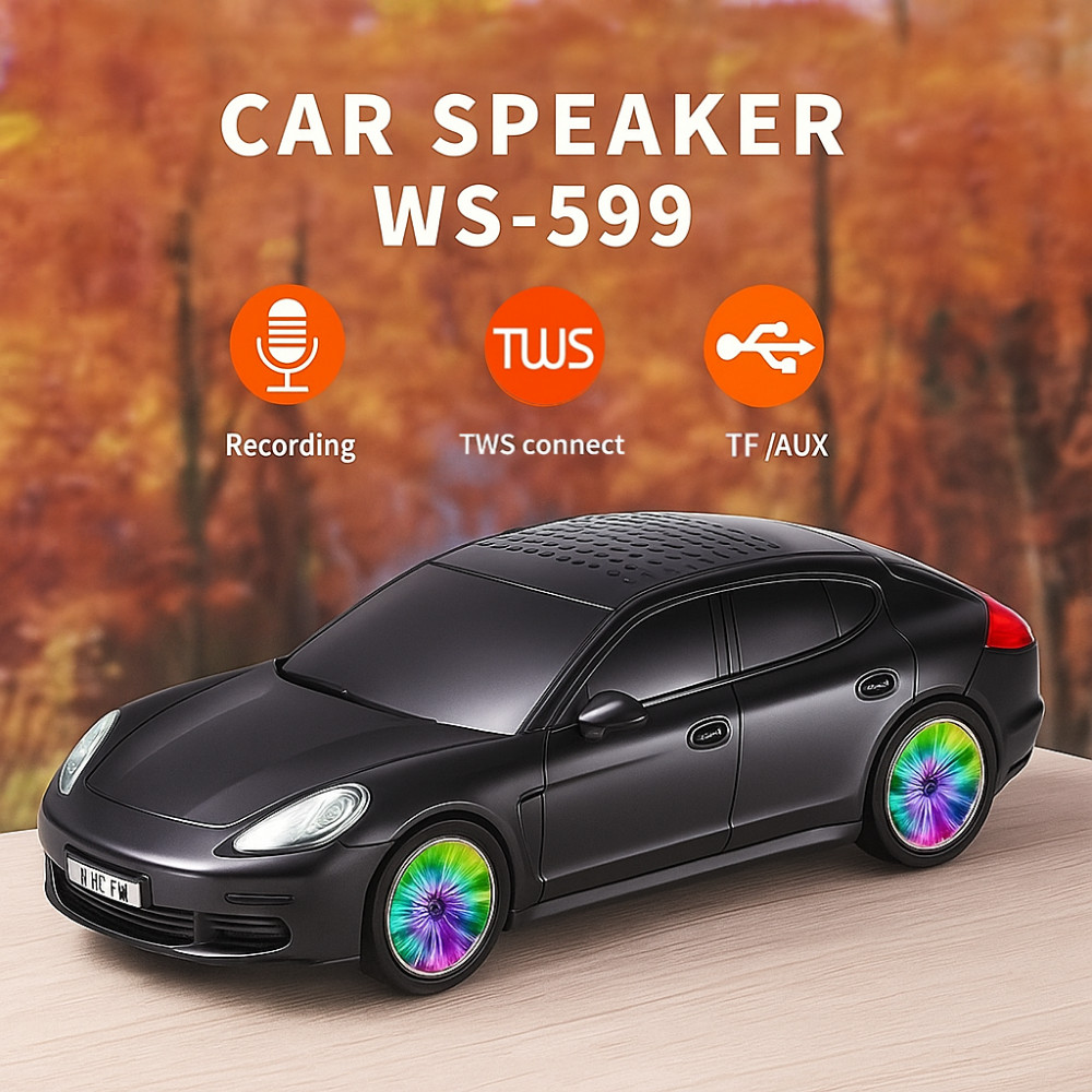 Dobd fel a zenehallgatást ezzel a különleges, sportautó formájú hangszóróval! A WS-599 nemcsak egy praktikus vezeték nélküli eszköz, hanem igazi látványosság is – színes LED világítással a kerekeken, modern dizájnnal és sokoldalú funkciókkal.