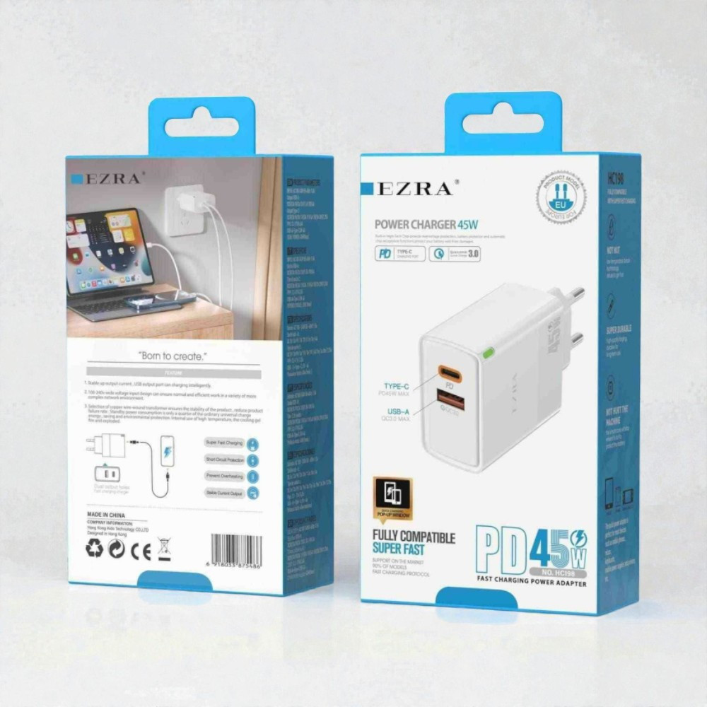 Az EZRA 45 W-os hálózati gyorstöltő nagy teljesítményt és modern technológiát kínál kompakt méretben. A USB-C Power Delivery (PD) és USB-A Quick Charge 3.0 támogatásnak köszönhetően ideális okostelefonok, tabletek, laptopok és egyéb USB-eszközök gyors és biztonságos töltésére.