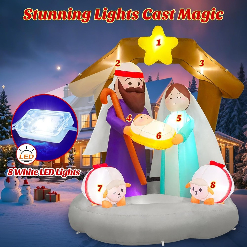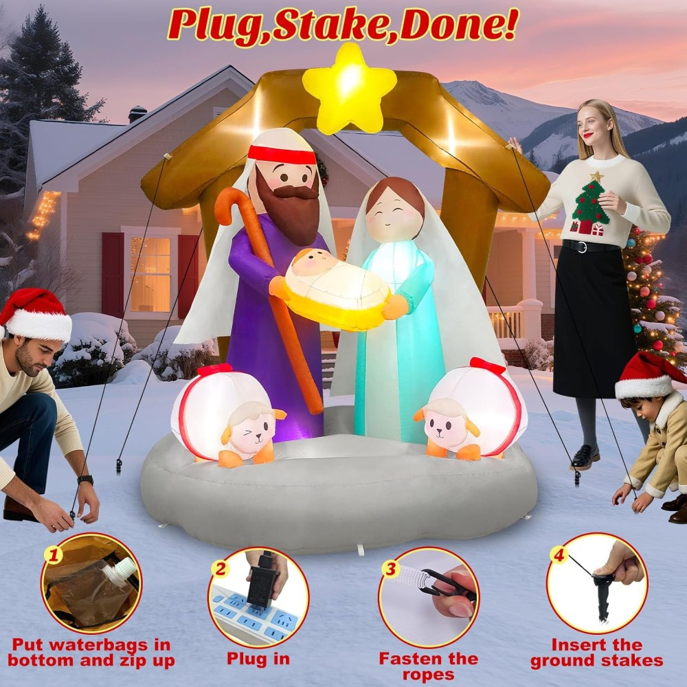 épj be az ünnepi csodába ezzel a 180 cm magas, felfújható „Betlehem” dekorációval, mely az éjszakai kertben is ragyogó fényfestményt varázsol! A dekoráció a Jézus-születés jelenetét idézi meg, modern megvilágítással és könnyű felállíthatósággal – tökéletes kültéri és fedett beltéri használatra egyaránt.