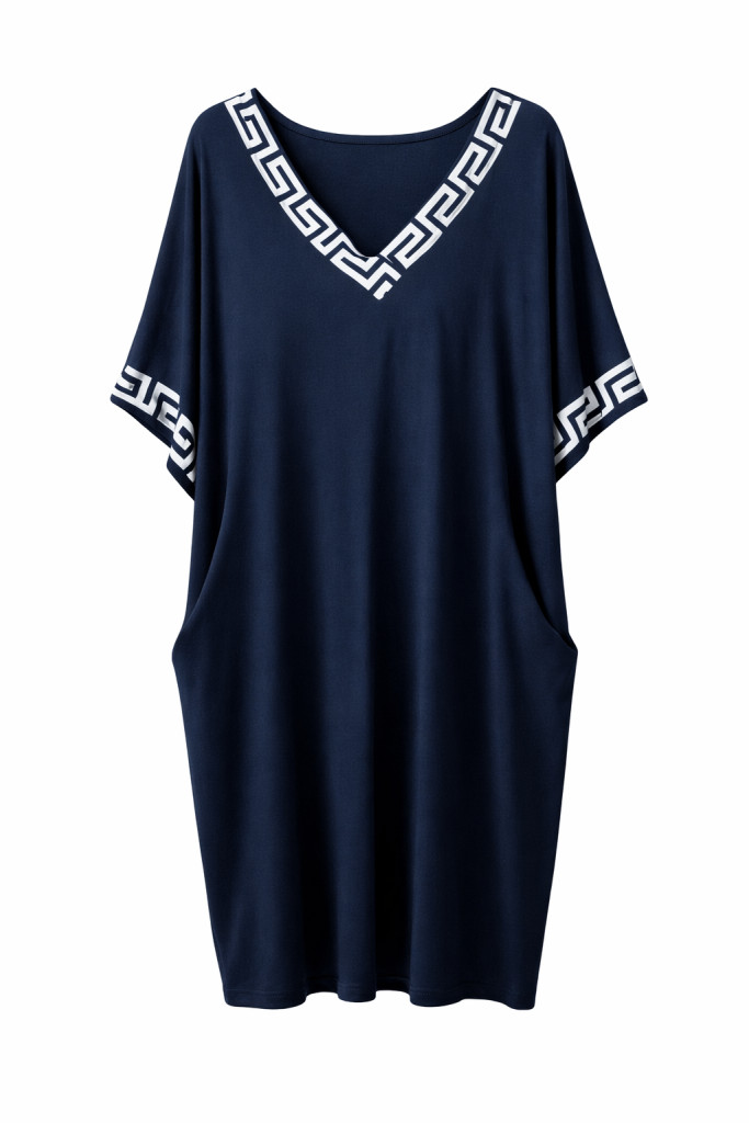 Görögmintás női V-nyakú zsebes ruha, laza bő fazon - Sötétkék