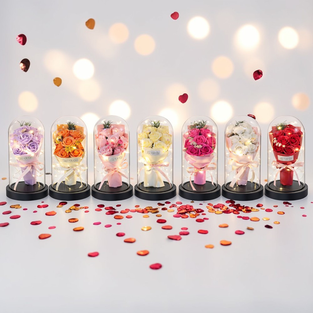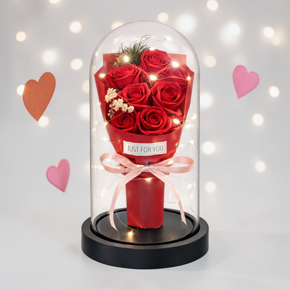 Lepd meg szeretteidet egy időtálló, elegáns virágkompozícióval! Az üvegbura alatt elhelyezett dekor rózsacsokrot finom, meleg fényű LED világítás teszi igazán különlegessé. A romantikus hangulat garantált – tökéletes ajándék Valentin-napra, évfordulóra, születésnapra vagy akár anyák napjára.
