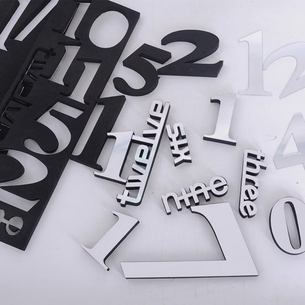 Ez a modern, DIY falióra különleges megjelenésével azonnal feldobja a falat. A számlap vegyes stílusú számokkal (arab számok, angol feliratok és római jelölések) készül, így egyszerre játékos és elegáns. A számok szabadon elhelyezhetők, ezért az óra mérete és elrendezése teljesen az enteriőrhöz igazítható.