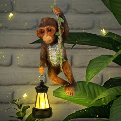 Dobd fel kerted vagy teraszod hangulatát ezzel a különleges, kötélről lógó kis majom figurával! A kezében tartott vintage stílusú lámpás meleg, hangulatos fényt áraszt, amely varázslatos atmoszférát teremt az esti órákban.