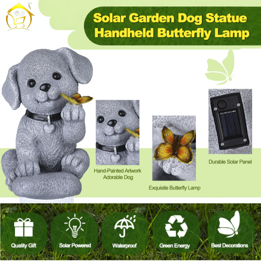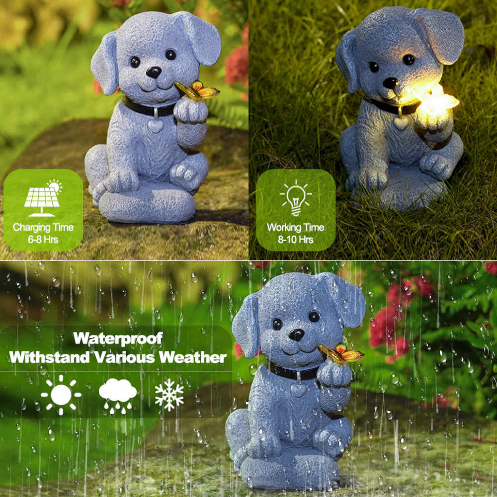 Ez a bájos kiskutya figura nemcsak aranyos kerti dísz, hanem praktikus, napelemes hangulatlámpa is egyben. A mancsában tartott pillangó sötétedéskor finom, meleg fényt bocsát ki, így varázslatos esti hangulatot teremt a kertben vagy a teraszon.