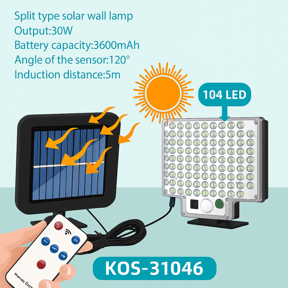 A lámpa 104 darab nagy fényerejű LED-del rendelkezik, amelyek kiváló megvilágítást biztosítanak még teljes sötétségben is. A különálló napelem panel lehetővé teszi a rugalmas elhelyezést, így a fényforrás ott lehet, ahol szükség van rá, a panel pedig ott, ahol a legtöbb napfényt kapja.