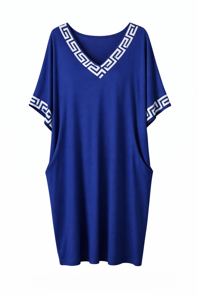 Görögmintás női V-nyakú zsebes ruha, laza bő fazon - Királykék