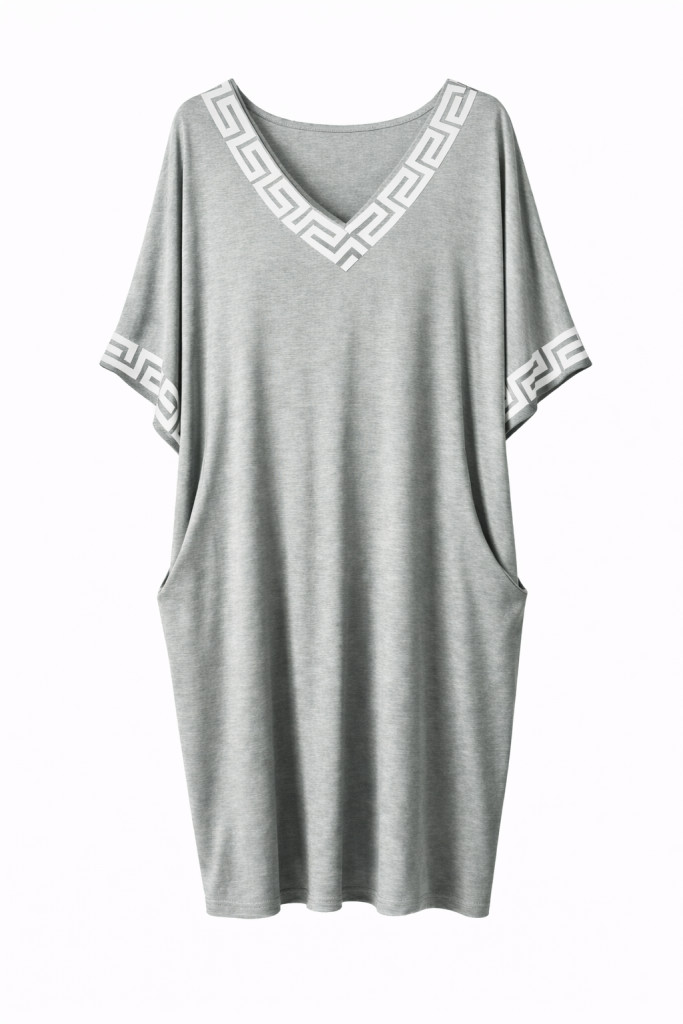 Görögmintás női V-nyakú zsebes ruha, laza bő fazon - Világos szürke