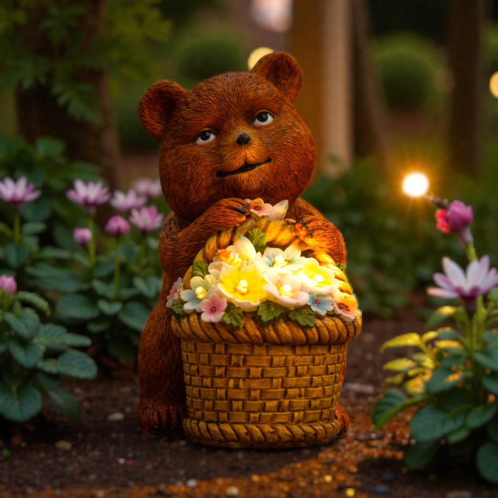 Ez az aranyos maci figura virágokkal teli kosarat tart a kezében, amely sötétedéskor meleg, meghitt fényt áraszt. Tökéletes választás, ha mesés, barátságos hangulatot szeretnél teremteni kertedben vagy teraszodon.
