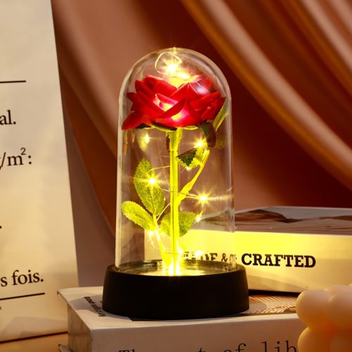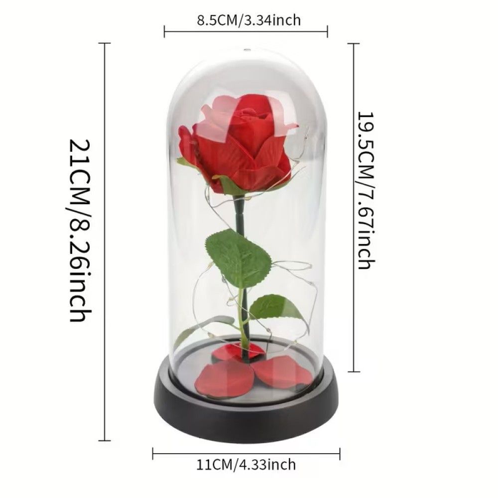 Az átlátszó üvegbúra elegáns megjelenést biztosít, miközben védi a rózsát a portól és sérülésektől. A beépített színváltós LED fények romantikus, meghitt atmoszférát teremtenek nappaliban, hálószobában vagy akár ünnepi dekorációként.